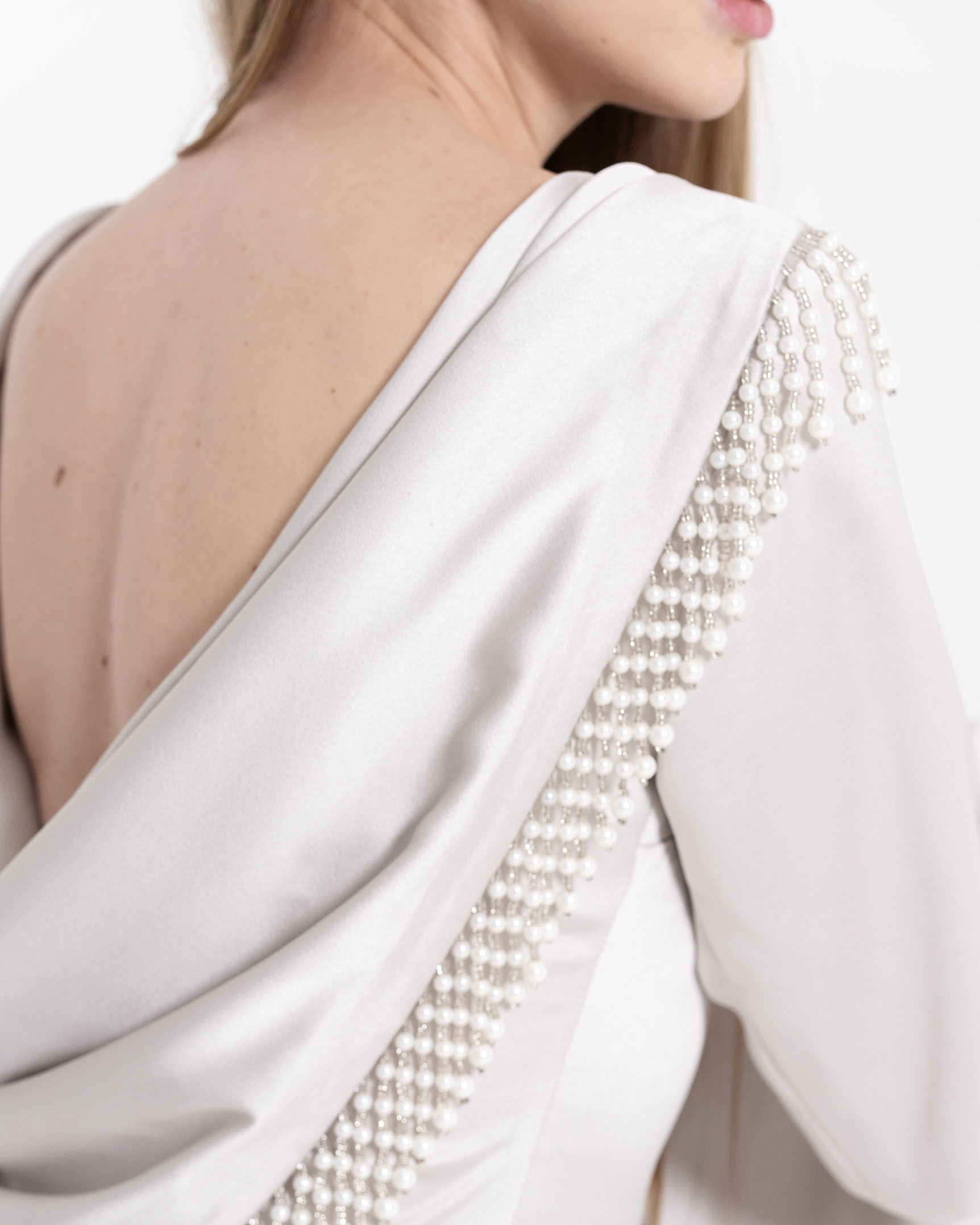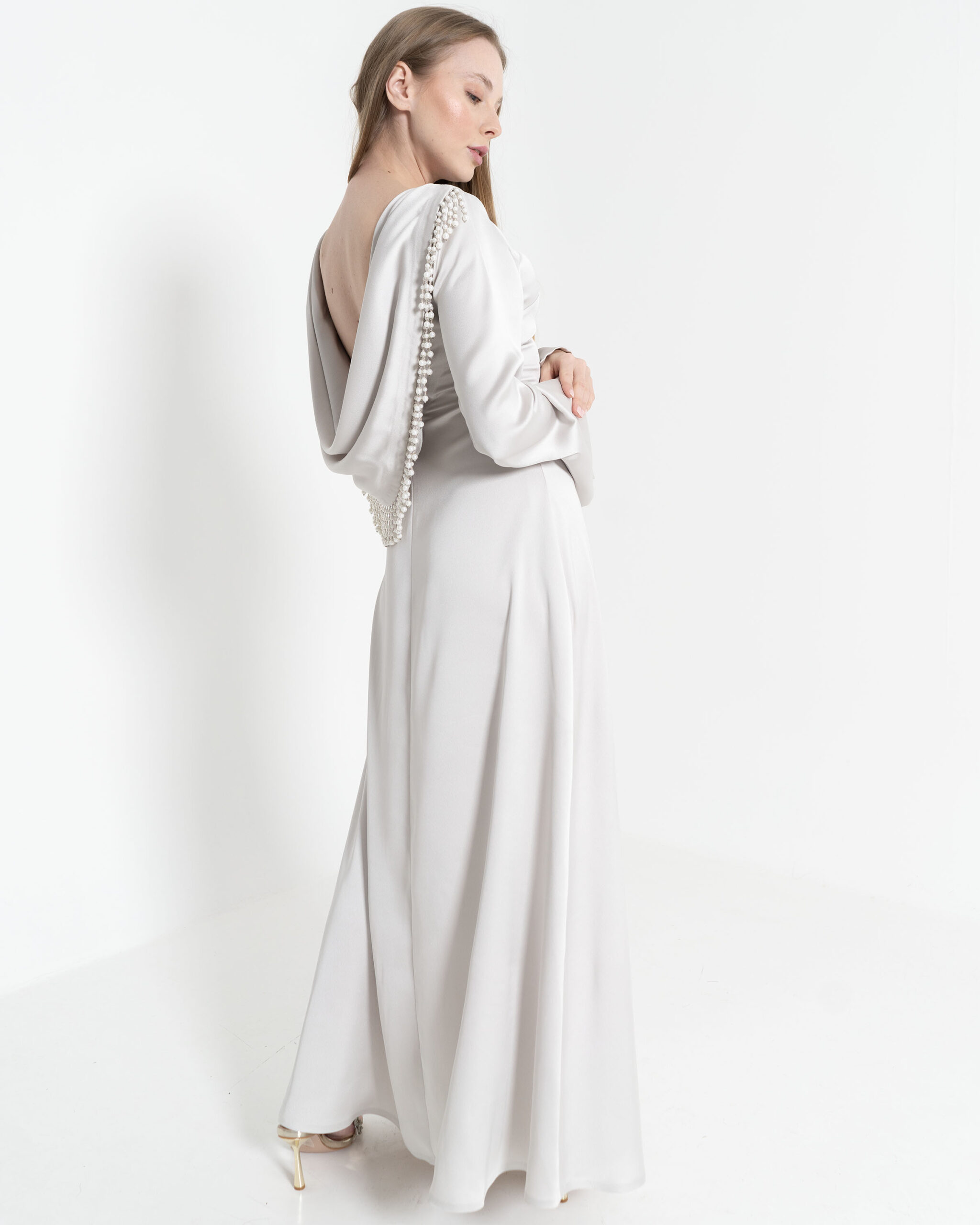 فستان رمادي راقي بتصميم فريد.